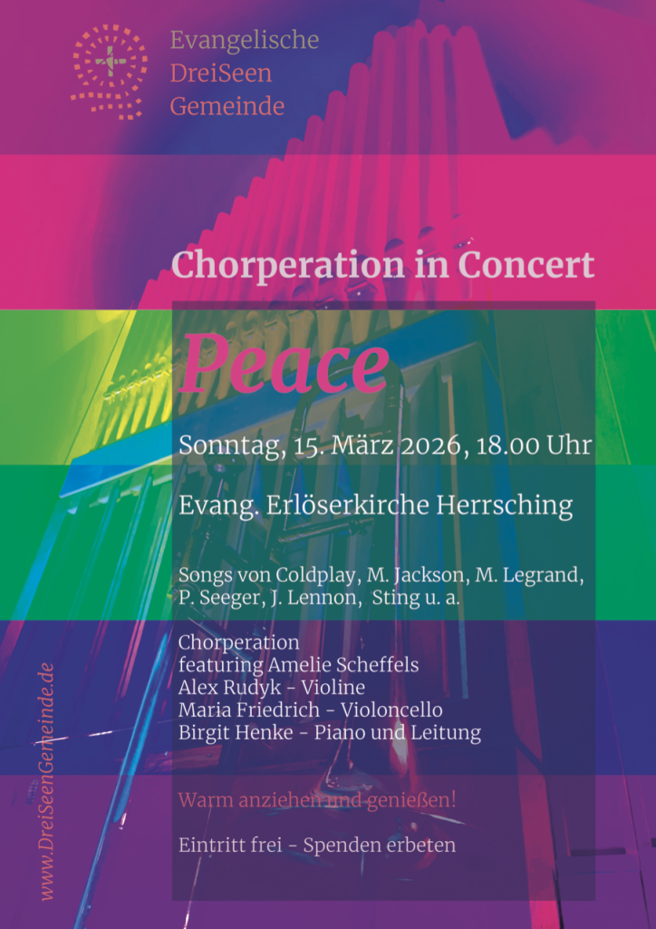 Herzliche Einladung zum Konzert des Projektchors Chorperation zum Thema "Peace". Gesungen werden Songs von Coldplay, M. Jackson, M. Legrand, P. Seeger, Sting u.a.